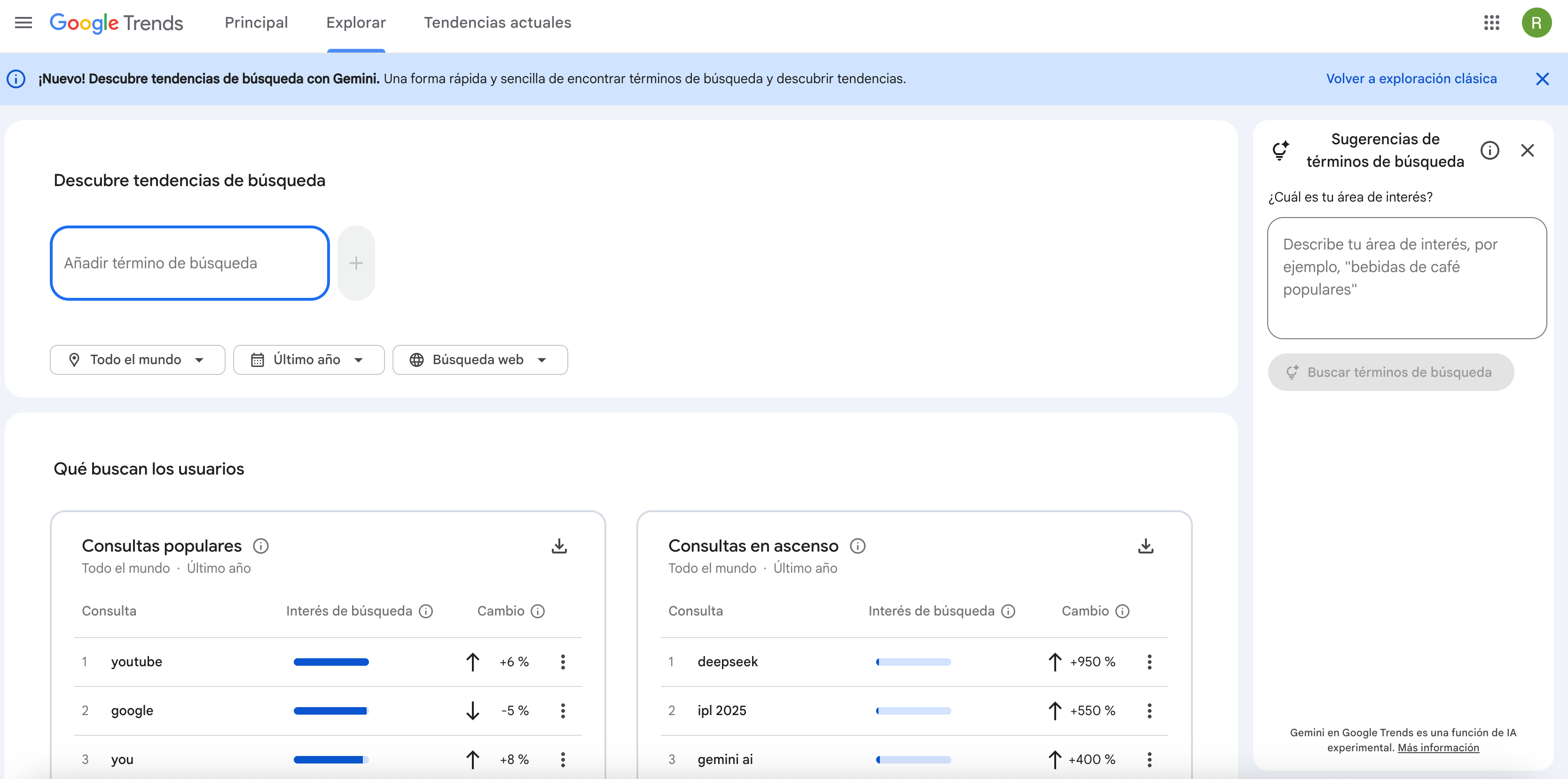 Hasta ahora, Google Trends era un lienzo en blanco. Si no sabías qué preguntar, la herramienta no tenía nada que decirte. Con la llegada de Gemini, la página de exploración ahora incluye un panel lateral que identifica y compara automáticamente tendencias relevantes para tu área de interés.