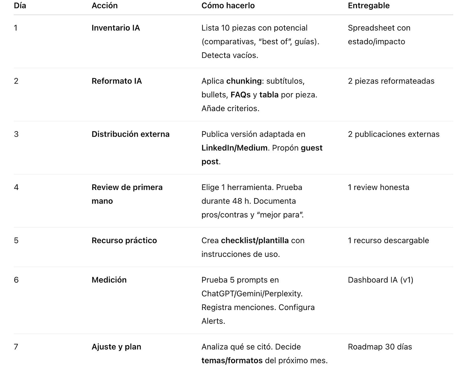 Acción: reescribe tus top 5 piezas en bloques semánticos: subtítulos, bullets, tablas, FAQs, veredictos.