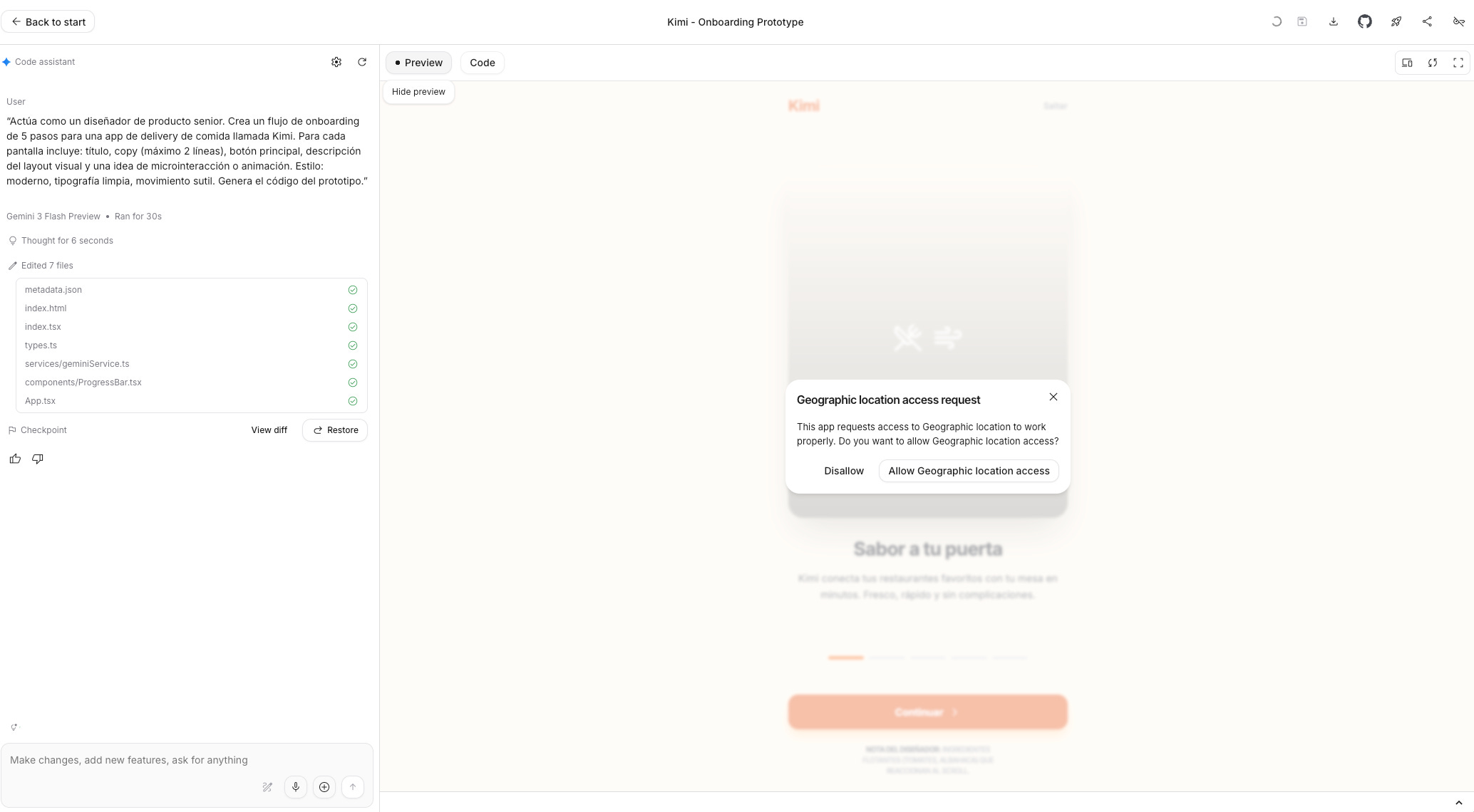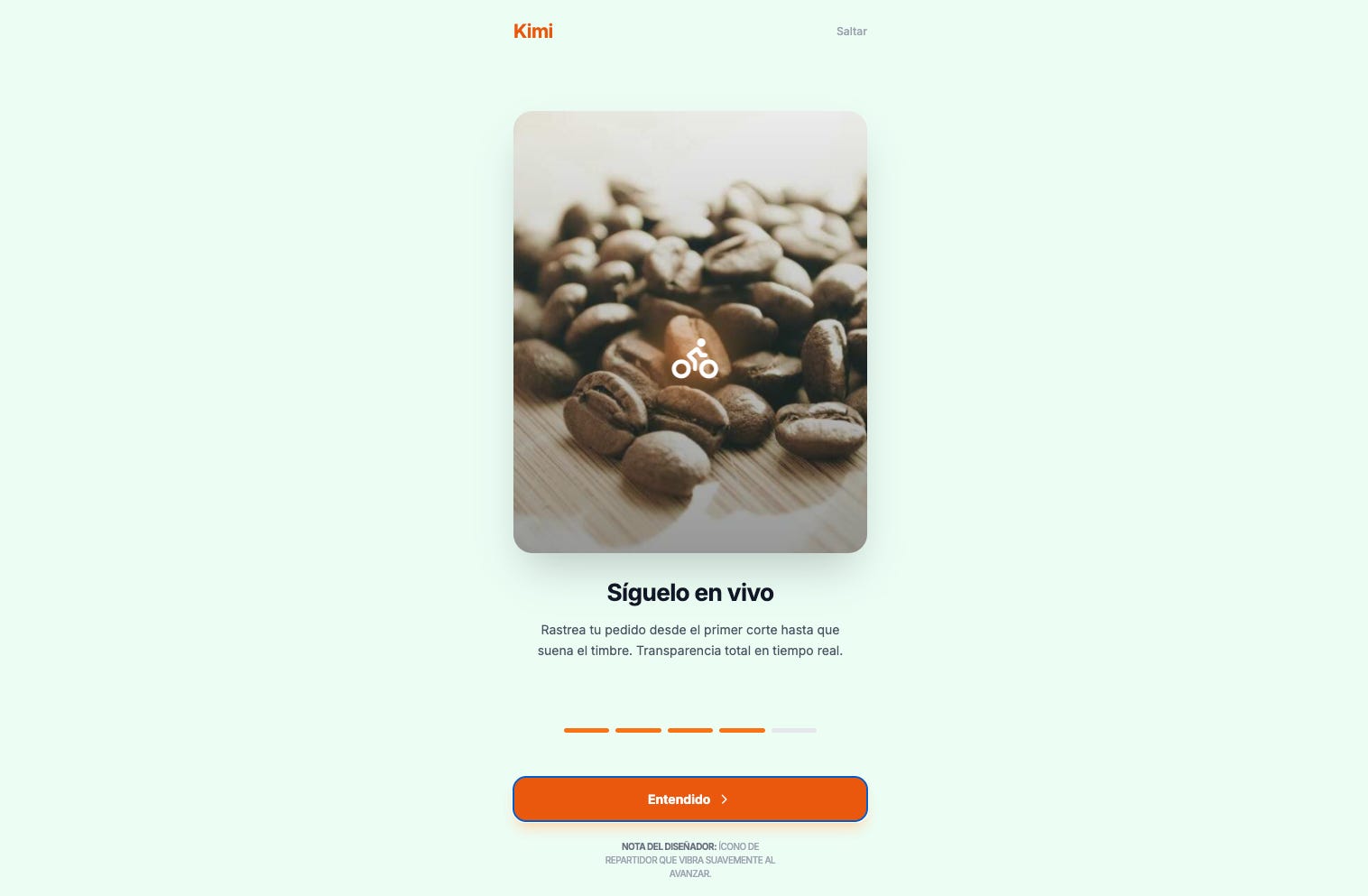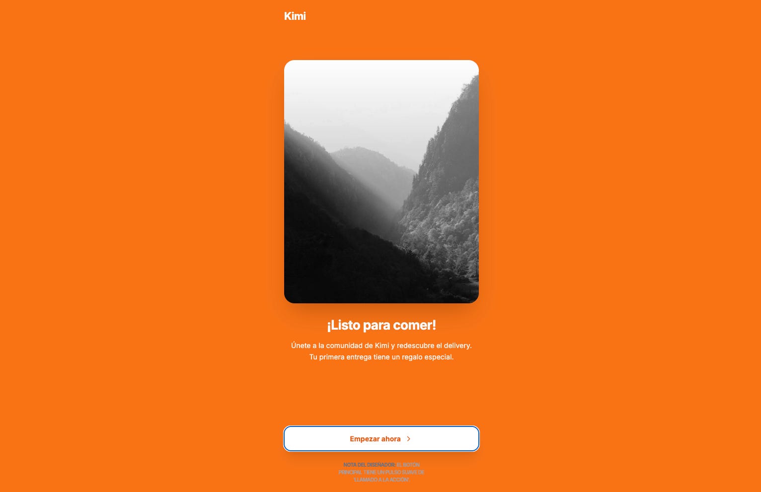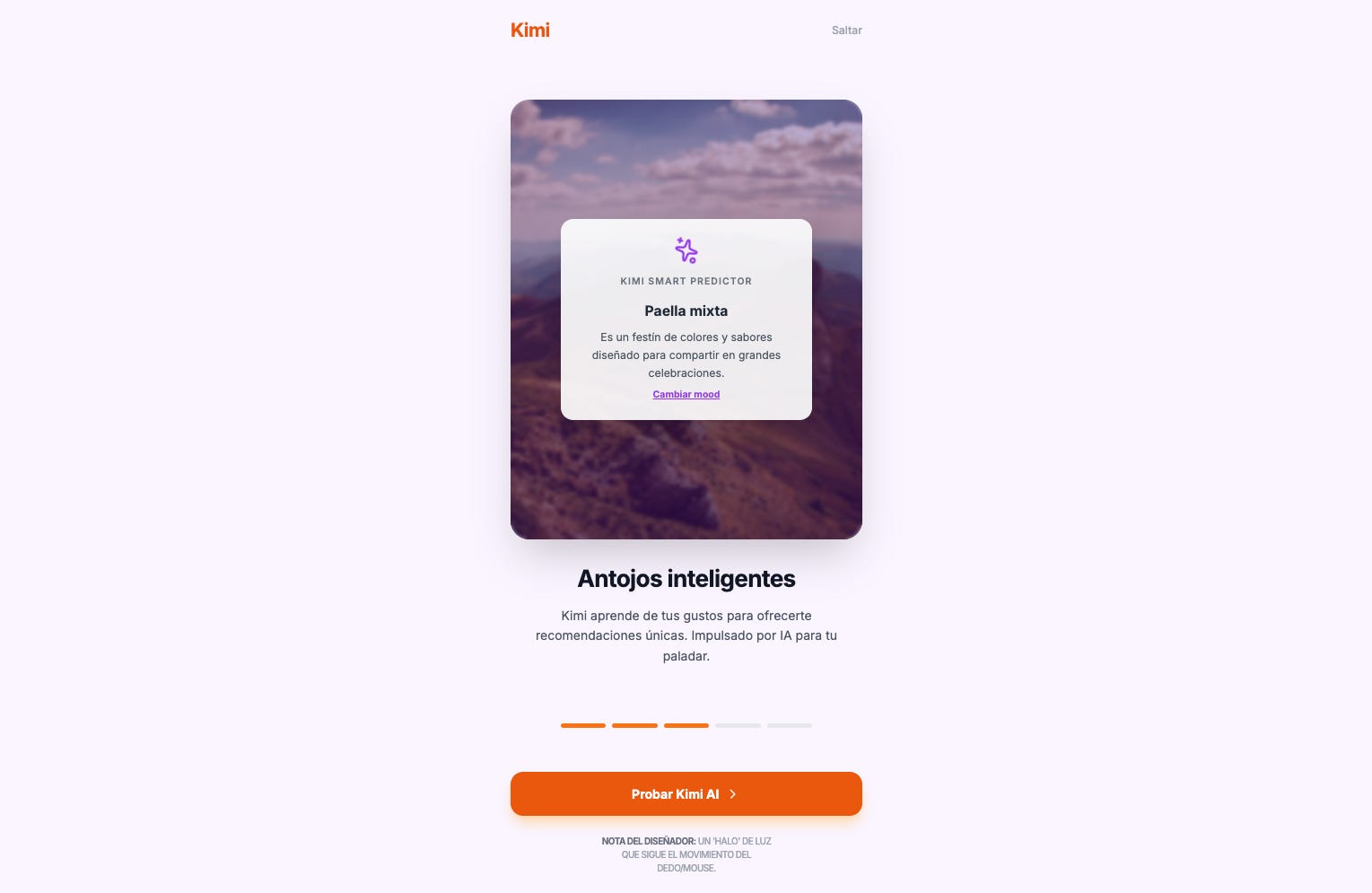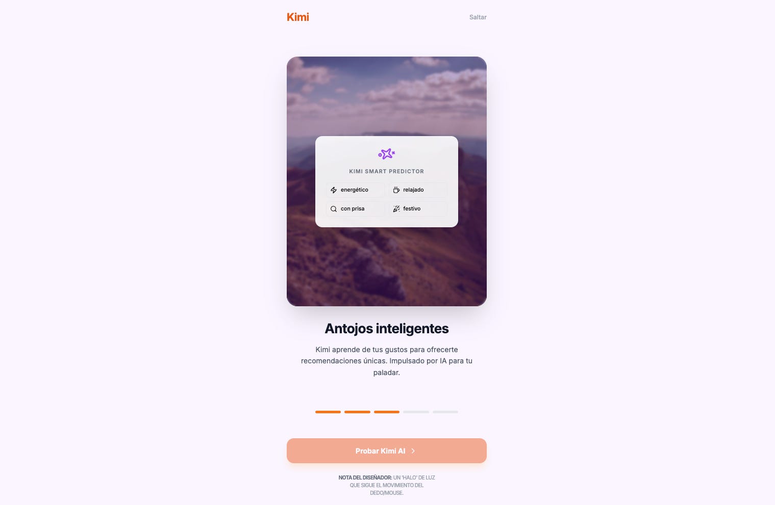 “Actúa como un diseñador de producto senior. Crea un flujo de onboarding de 5 pasos para una app de delivery de comida llamada Kimi. Para cada pantalla incluye: título, copy (máximo 2 líneas), botón principal, descripción del layout visual y una idea de microinteracción o animación. Estilo: moderno, tipografía limpia, movimiento sutil. Genera el código del prototipo.”